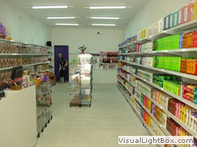 Gôndola de centro com testeira decorativa e gôndola de parede com opção testeira iluminada