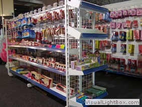 Gôndola com acessórios, prateleiras e barras com ganchos para encartelados